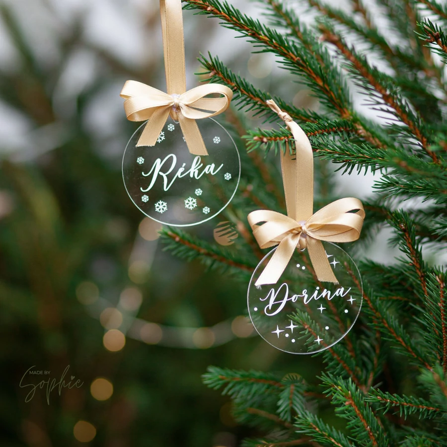 8 cm átmérőjű egyedi feliratos kör plexi karácsonyfadísz masnival.